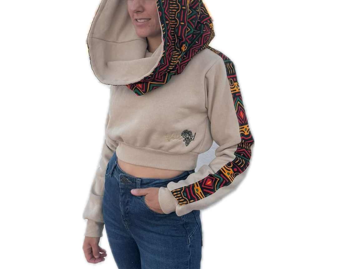 Sudaderas beige con cuello y detalles tribales de telas africanas en mangas. Son sudaderas cortas tipo cropped. Todas ellas diseñadas con mucho cariño y con el forro muy calentito. Logo de Africsoul bordado.