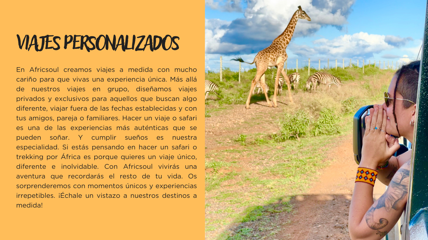 Ofrecemos viajes a medida en 4 destinos de África actualmente, podéis diseñar el itinerario, las actividades, tipo de alojamiento y duración. ¿A qué esperas? Escríbenos y cuéntanos tu idea, vamos a hacerla realidad siempre con la filosofía Africsoul.